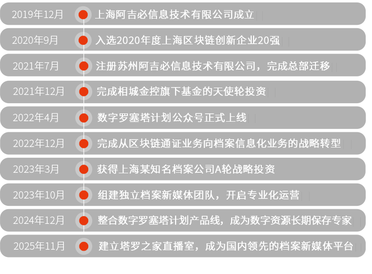 上海阿吉必信息技术有限公司是一家运用人工智能、长期保存等技术,面向档案馆(室)、档案从业机构(人员)提供新媒体运营、信息化咨询、数字保存的专业服务商。 愿景:成为全国领先的档案新媒体服务提供商 宗旨:让档案事业焕发光彩 使命: 保存社会记忆,传承人类文明 价值观:共生、共创、共治、共享、共赢